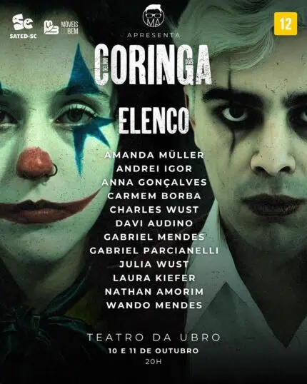 Taxa Fixa de R$ 2,00 por pedido Utilize o CUPOM do elenco na sua compra Elenco: Annacoringa Juliacoringa Charlescoringa Davicoringa Mendescoringa Caminhacoringa Amandacoringa Nathancoringa Wandocoringa Carmemcoringa Andreicoringa Lauracoringa*Tem direito a meia entrada estudantes, idosos, jovens de baixa renda, professores, doadores de sangue, PCD e um acompanhante, portadores de câncer É obrigatório documento que comprove o benefício Aos valores acima será acrescida a taxa de serviço Crianças de colo (com até 2 anos e 11 meses de idade) não pagam ingresso caso não ocupem assentos individuais. A partir de 3 anos o pagamento do assento é no valor da meia-entrada.