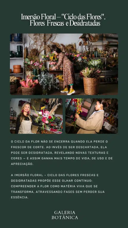 A Imersão Floral – Ciclo das Flores propõe esse olhar contínuo: compreender a flor como matéria viva que se transforma, atravessando fases sem perder sua essência.