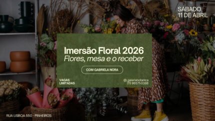 Além das técnicas florais e do estilo Galeria Botânica, a experiência se estende à mesa — integrando flores, estética e o gesto de receber.